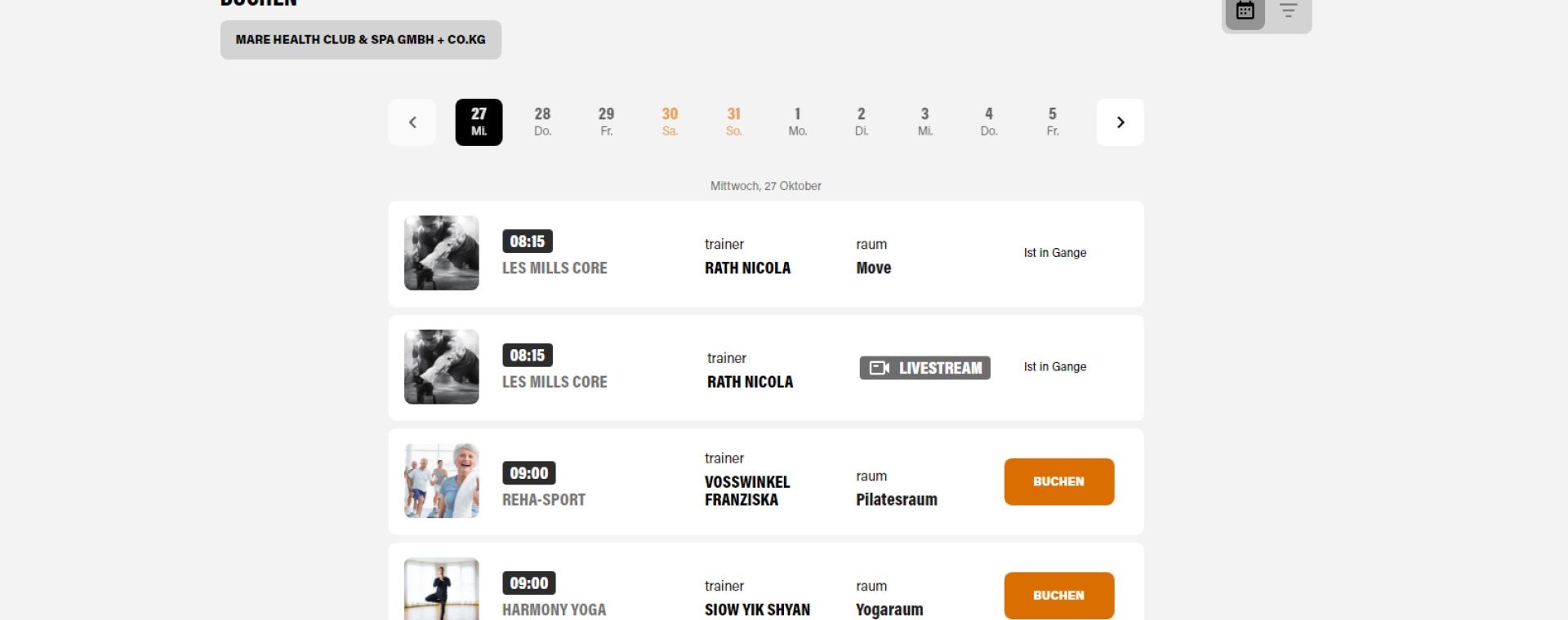 Die Anmeldung für die Kurse ist ab 12:00 Uhr sechs Tage im Voraus über die TECHNOGYM App möglich. Bitte halte Deine Anmeldedaten für die TECHNOGYM App bereit.