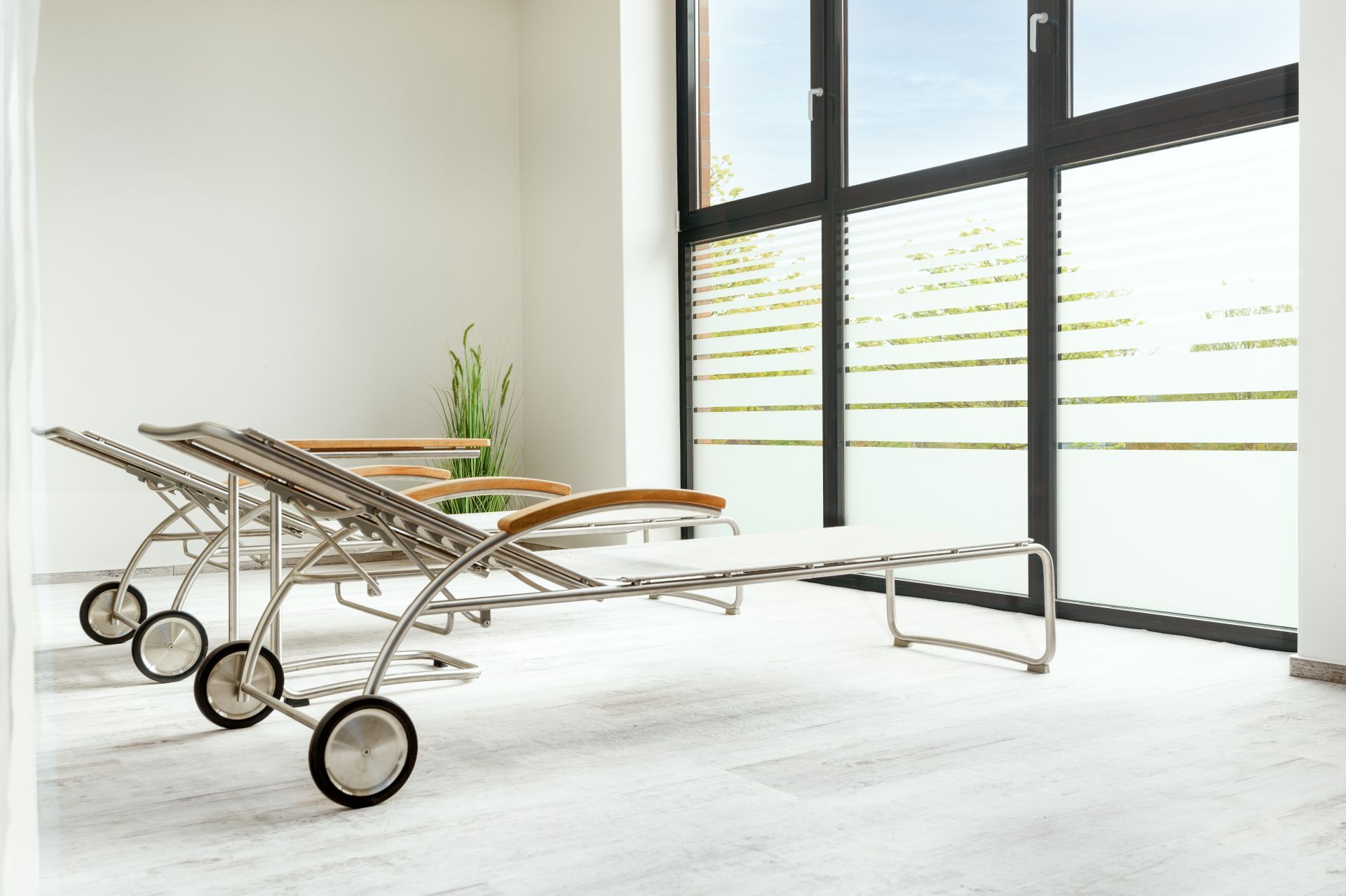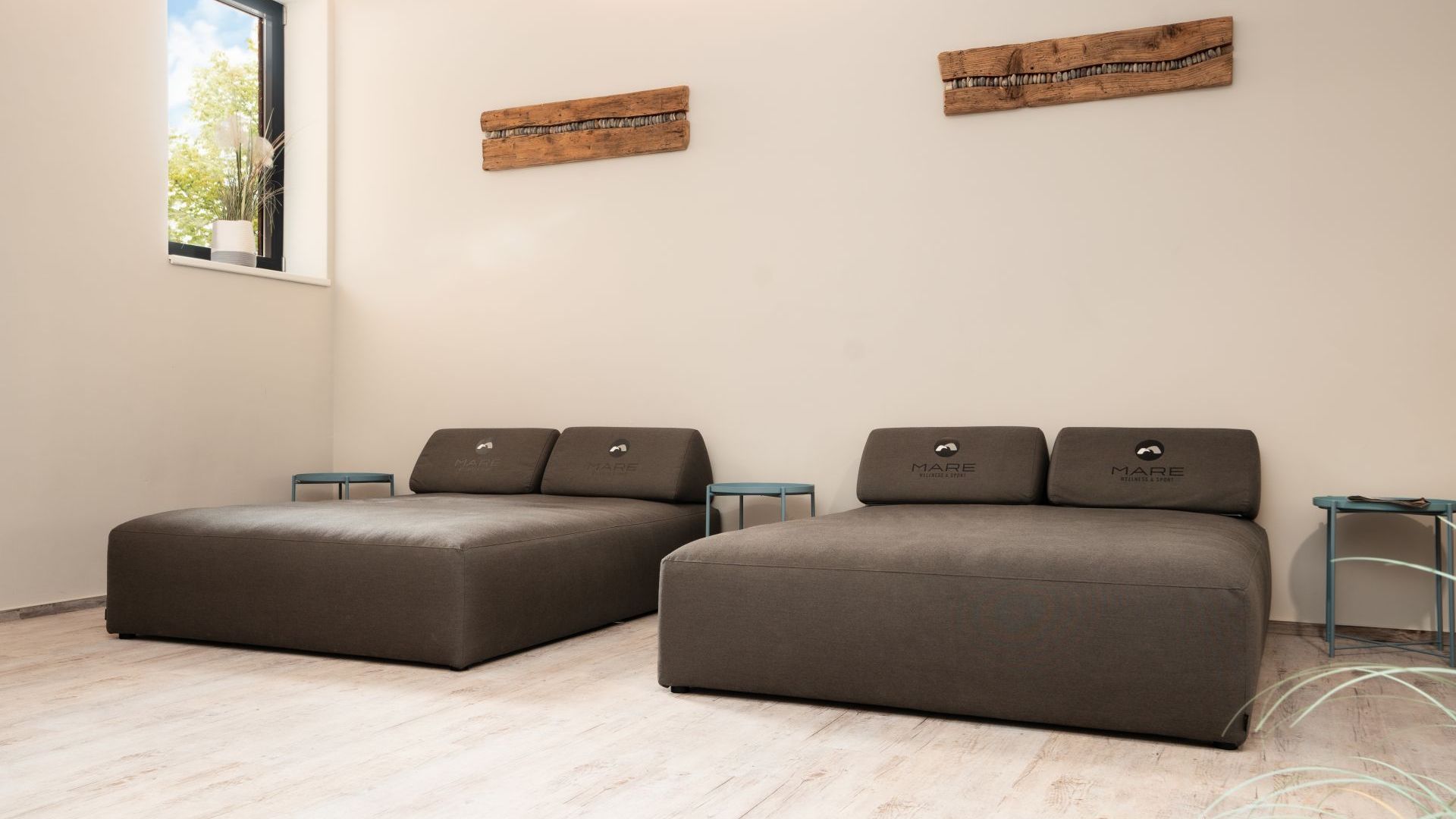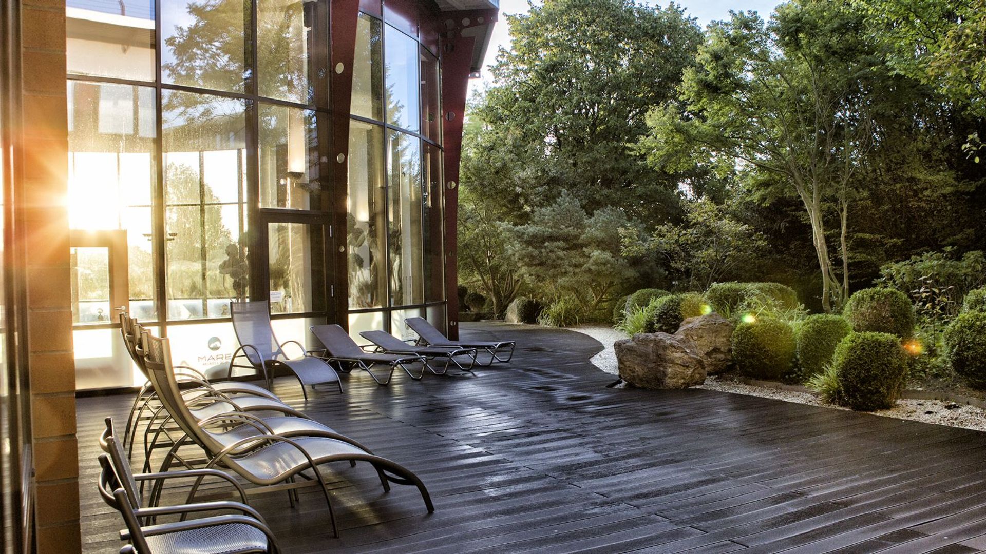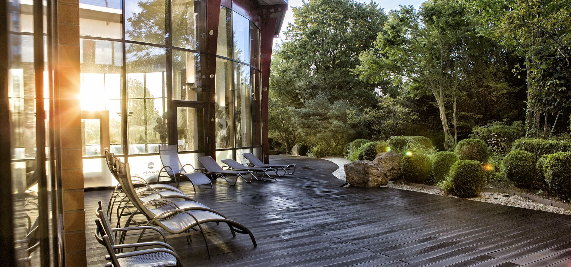 Unsere Außenterrasse im Saunabereich lädt dich ein, nach dem Saunagang frische Luft zu genießen und den Blick ins Grüne schweifen zu lassen. Tageslicht, Natur und eine ruhige Atmosphäre schaffen einen angenehmen Ort zum Durchatmen, Abkühlen und Verweilen.