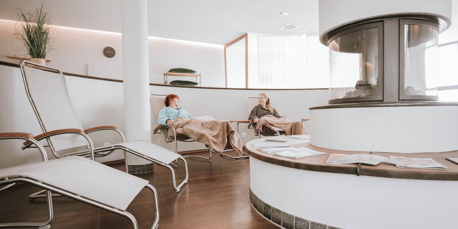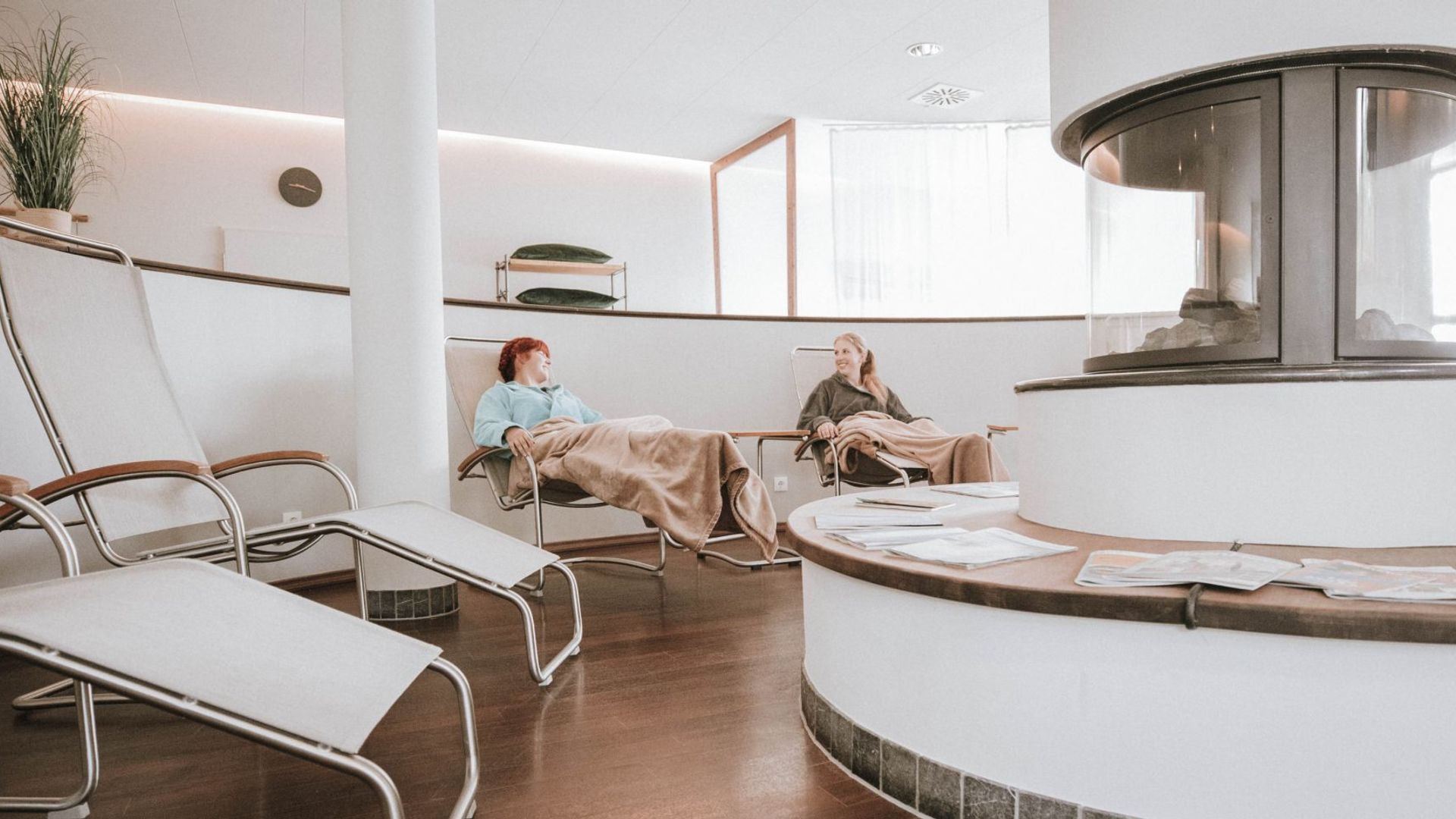 Im gesamten Wellnessbereich laden unterschiedliche Räume und Bereiche dazu ein, bewusst zur Ruhe zu kommen. Mal wohlig warm, mal ruhig und zurückgezogen, bieten sie Orte zum Verweilen, Durchatmen und Krafttanken. Es erwartet Sie in Ruheraum mit Liegewiesen, Liegestühlen, Sofas und einem Kamin. Des Weiteren laden Wärmeliegen im Saunabereich zum Erholen ein.